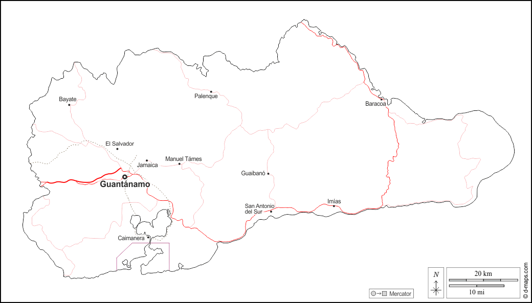 d-maps > महाअमेरिका > क्यूबा > ग्वांतानामो प्रांत > बाह्यरेखा, मुख्य शहरों, सड़कों, नाम, सफेद