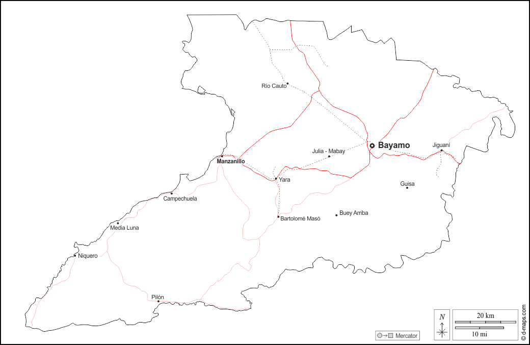 d-maps > महाअमेरिका > क्यूबा > ग्रानमा प्रांत > बाह्यरेखा, मुख्य शहरों, सड़कों, नाम, सफेद