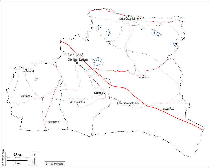 d-maps > महाअमेरिका > क्यूबा > मायाबेक प्रांत > बाह्यरेखा, जल-सर्वेक्षण, मुख्य शहरों, सड़कों, नाम, सफेद