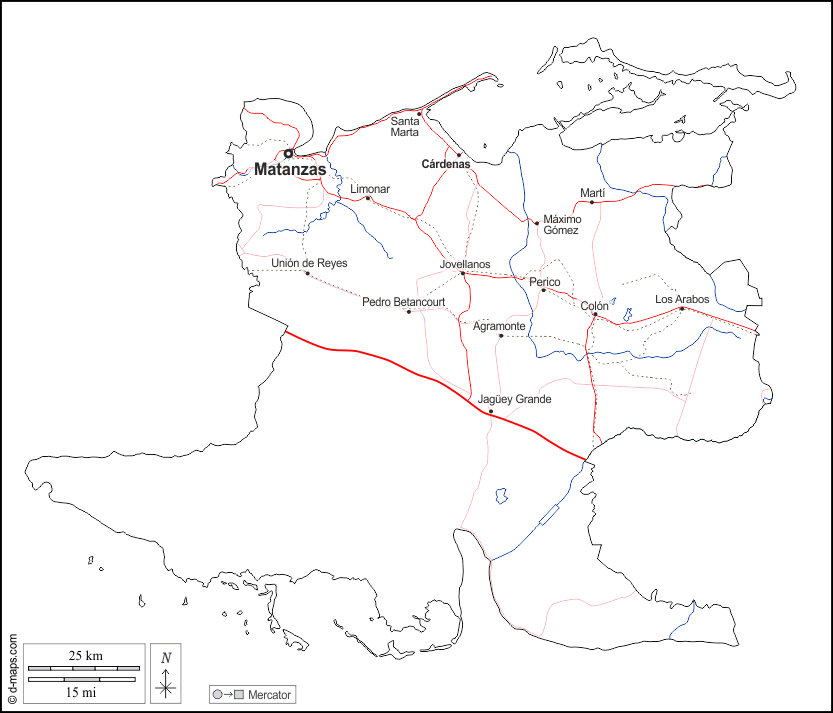 d-maps > महाअमेरिका > क्यूबा > मतान्ज़स प्रांत > बाह्यरेखा, जल-सर्वेक्षण, मुख्य शहरों, सड़कों, नाम, सफेद