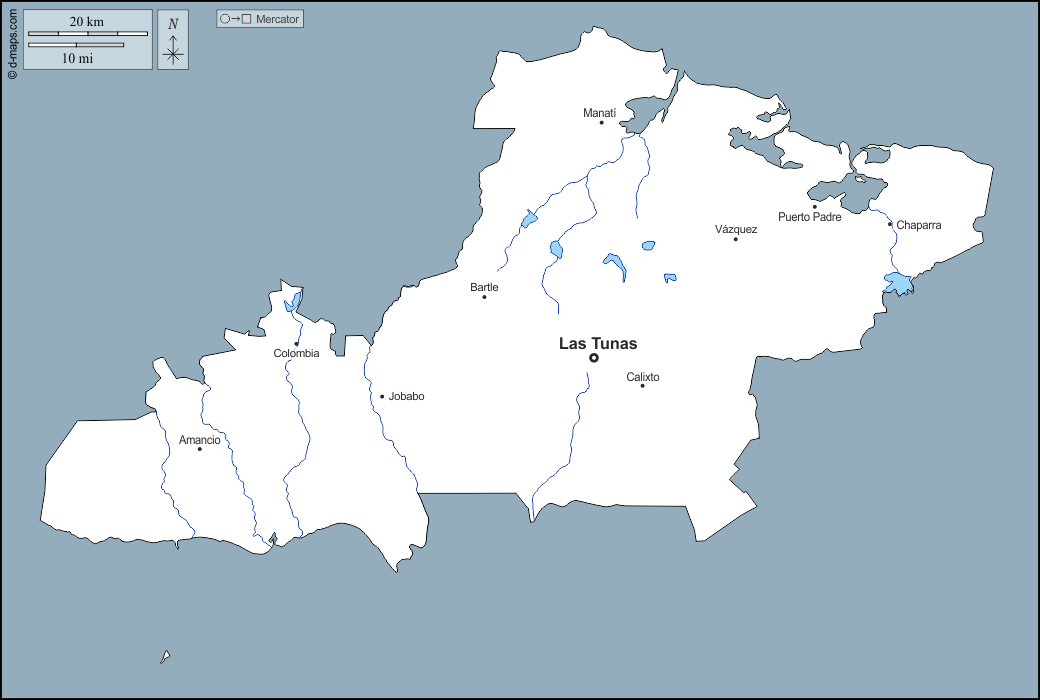 d-maps > महाअमेरिका > क्यूबा > लास टुनास प्रांत > बाह्यरेखा, जल-सर्वेक्षण, मुख्य शहरों, नाम