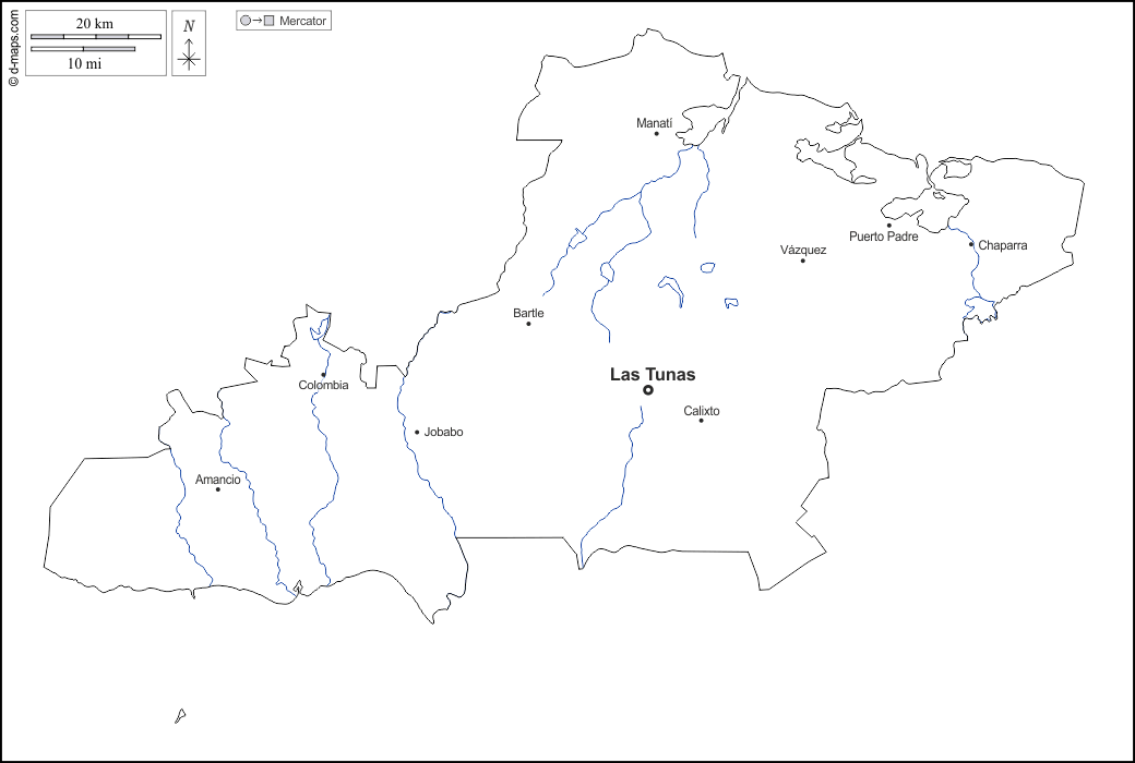 d-maps > महाअमेरिका > क्यूबा > लास टुनास प्रांत > बाह्यरेखा, जल-सर्वेक्षण, मुख्य शहरों, नाम, सफेद