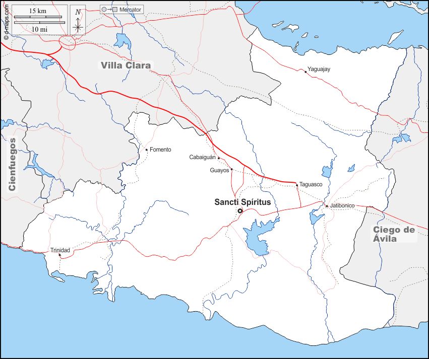 d-maps > महाअमेरिका > क्यूबा > सैंक्टी स्पिरिटस प्रांत > सीमाओं, जल-सर्वेक्षण, मुख्य शहरों, सड़कों, नाम