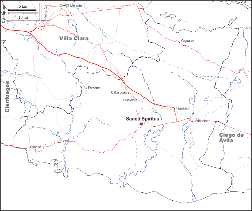 d-maps > महाअमेरिका > क्यूबा > सैंक्टी स्पिरिटस प्रांत > सीमाओं, जल-सर्वेक्षण, मुख्य शहरों, सड़कों, नाम, सफेद
