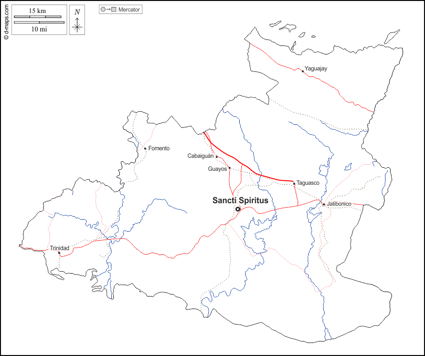 d-maps > महाअमेरिका > क्यूबा > सैंक्टी स्पिरिटस प्रांत > बाह्यरेखा, जल-सर्वेक्षण, मुख्य शहरों, सड़कों, नाम, सफेद
