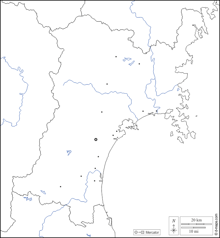 d-maps > एशिया > जापान > मियागी > सीमाओं, जल-सर्वेक्षण, मुख्य शहरों, सफेद