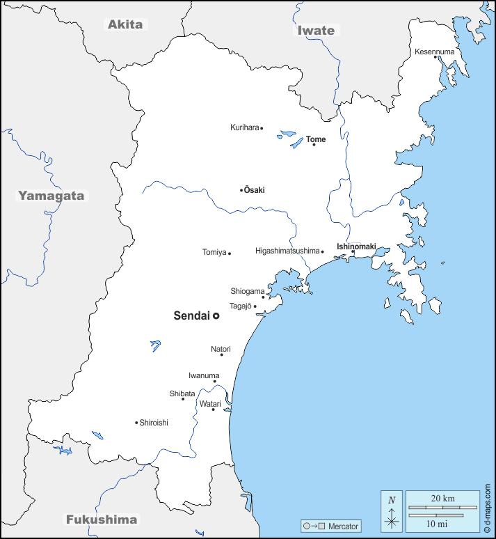 d-maps > एशिया > जापान > मियागी > सीमाओं, जल-सर्वेक्षण, मुख्य शहरों, नाम