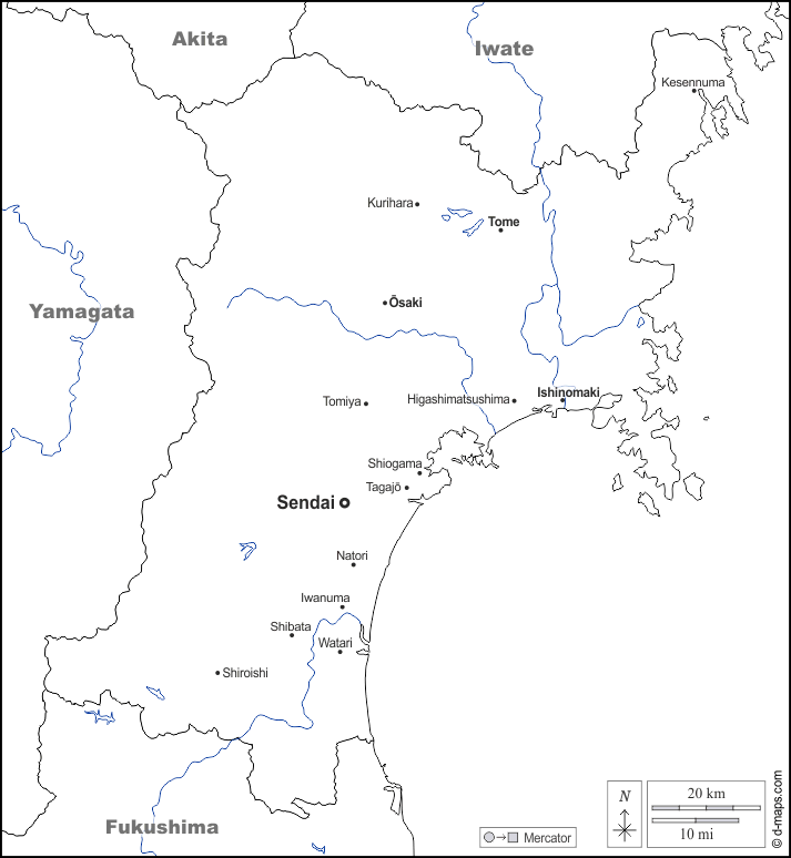 d-maps > एशिया > जापान > मियागी > सीमाओं, जल-सर्वेक्षण, मुख्य शहरों, नाम, सफेद