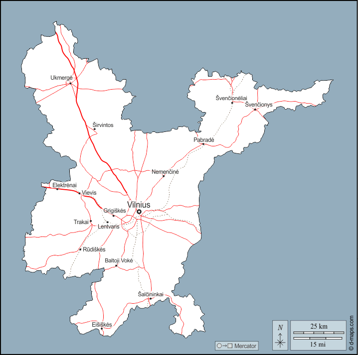 d-maps > यूरोप > लिथुआनिया > विनियस > बाह्यरेखा, मुख्य शहरों, सड़कों, नाम