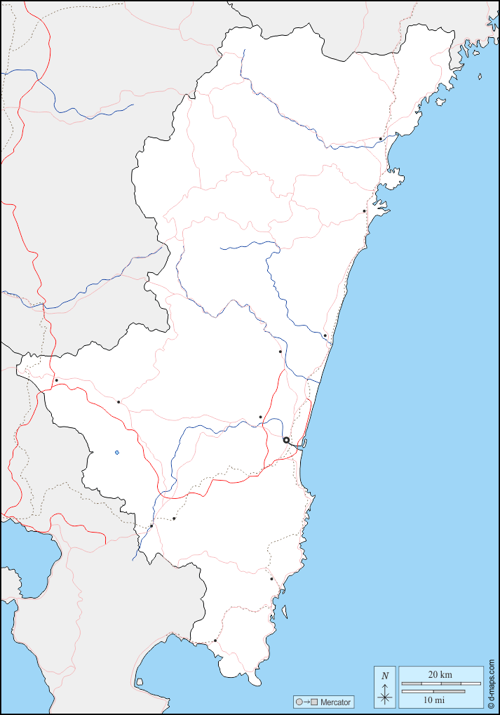 d-maps > एशिया > जापान > मियाज़ाकी > सीमाओं, जल-सर्वेक्षण, मुख्य शहरों, सड़कों