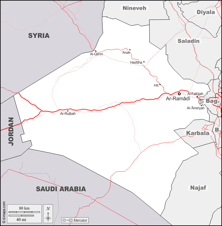 d-maps > एशिया > इराक > अल अनबर > सीमाओं, मुख्य शहरों, सड़कों, नाम