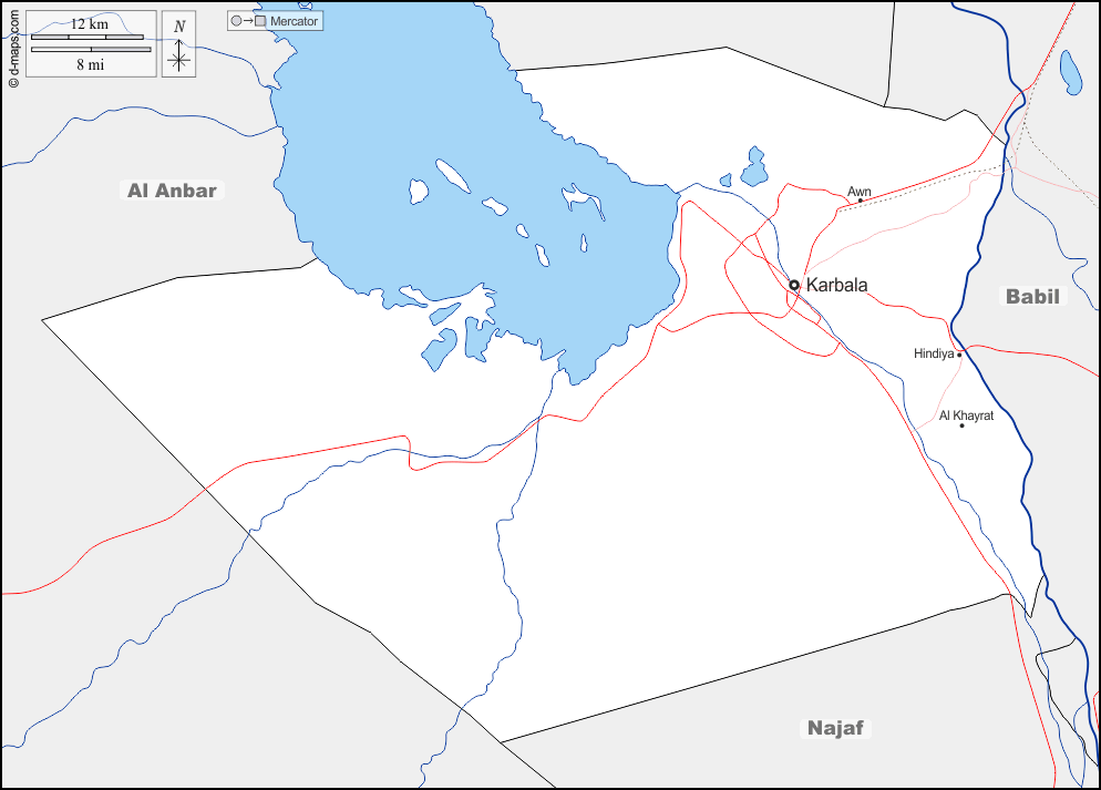 d-maps > एशिया > इराक > कर्बला > सीमाओं, जल-सर्वेक्षण, मुख्य शहरों, सड़कों, नाम