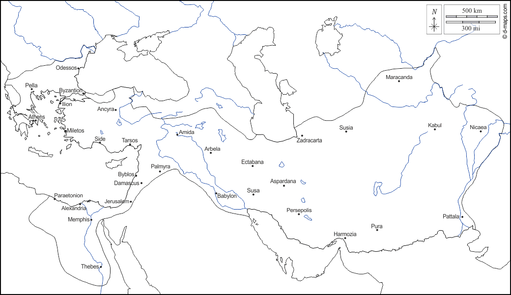 d-maps > ऐतिहासिक नक्शे > सिकंदर महान > सीमाओं, जल-सर्वेक्षण, प्रमुख शहरों, नाम, सफेद