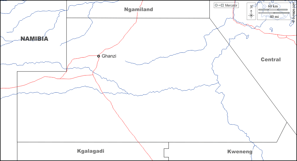 d-maps > अफ्रीका > बोत्सवाना > घांज़ी > सीमाओं, जल-सर्वेक्षण, मुख्य शहरों, सड़कों, नाम, सफेद