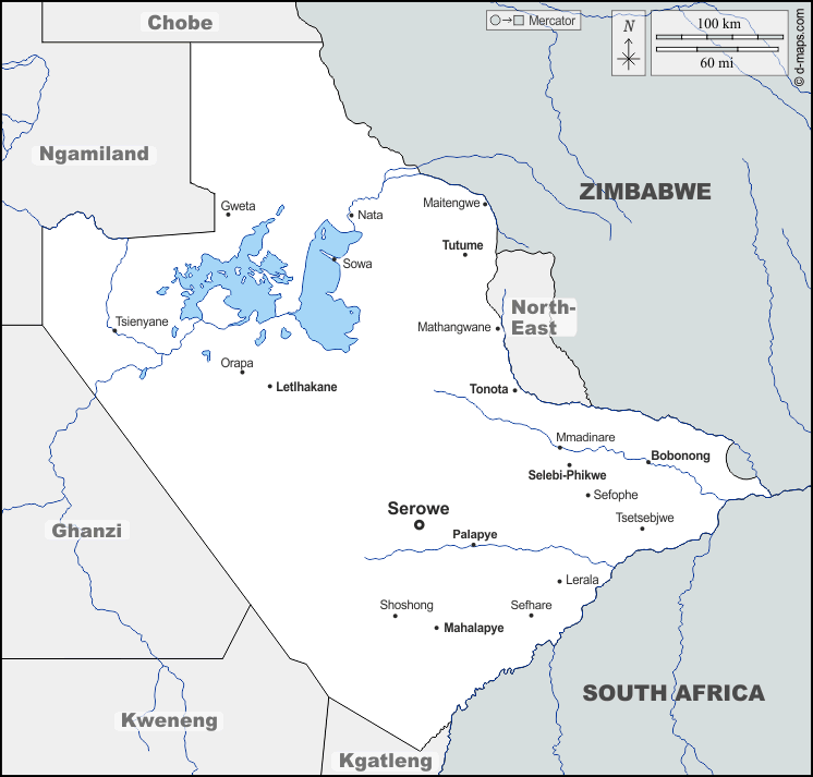 d-maps > अफ्रीका > बोत्सवाना > सेंट्रल ज़िला > सीमाओं, जल-सर्वेक्षण, मुख्य शहरों, नाम