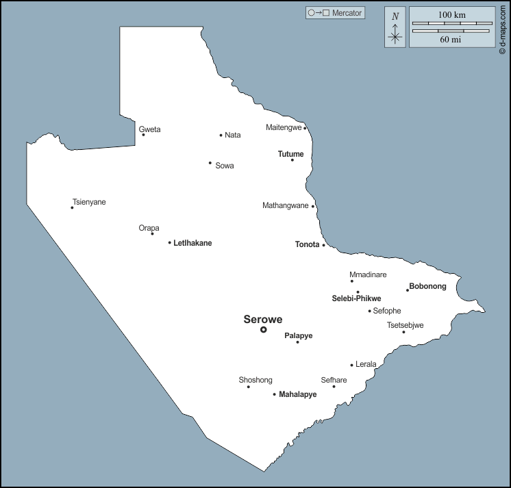 d-maps > अफ्रीका > बोत्सवाना > सेंट्रल ज़िला > बाह्यरेखा, मुख्य शहरों, नाम