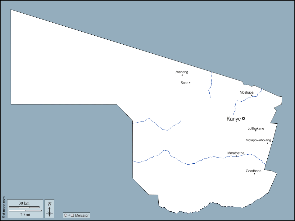 d-maps > अफ्रीका > बोत्सवाना > दक्षिण > बाह्यरेखा, जल-सर्वेक्षण, मुख्य शहरों, नाम