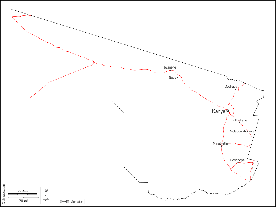 d-maps > अफ्रीका > बोत्सवाना > दक्षिण > बाह्यरेखा, मुख्य शहरों, सड़कों, नाम, सफेद