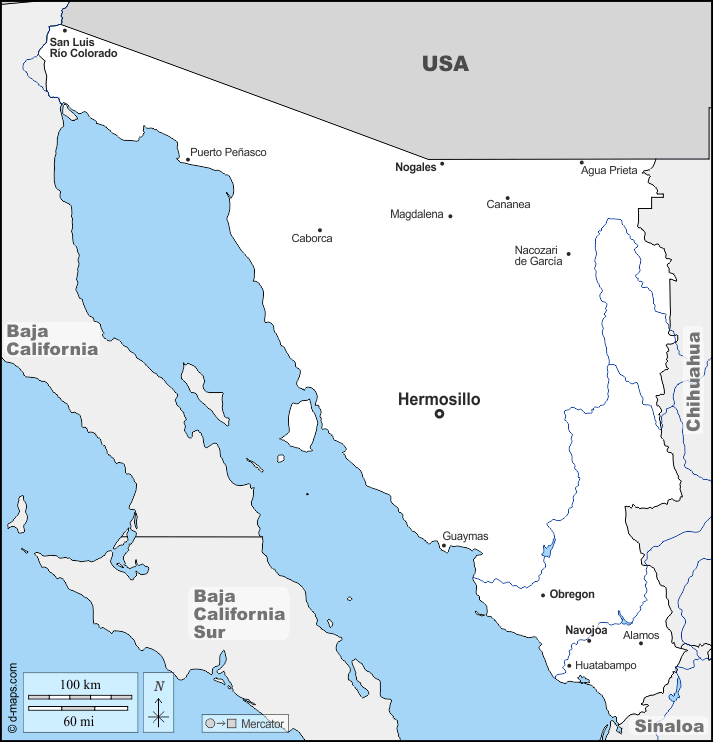 d-maps > महाअमेरिका > मेक्सिको > सोनोरा > सीमाओं, जल-सर्वेक्षण, मुख्य शहरों, नाम