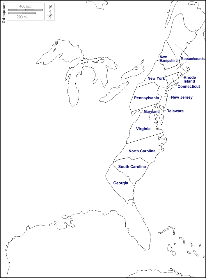 d-maps > ऐतिहासिक नक्शे > संयुक्त राज्य अमेरिका: 13 कालोनियों > तटों, सीमाओं, नाम, सफेद