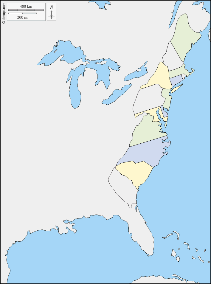 d-maps > ऐतिहासिक नक्शे > संयुक्त राज्य अमेरिका: 13 कालोनियों > तटों, सीमाओं, रंग