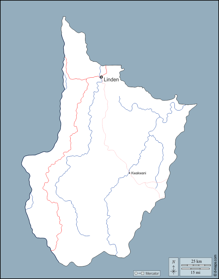 d-maps > महाअमेरिका > गुयाना > अपर डेमेरारा-बर्बिस > बाह्यरेखा, जल-सर्वेक्षण, मुख्य शहरों, सड़कों, नाम