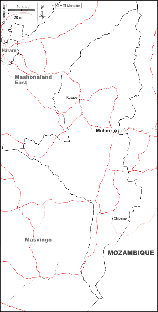 d-maps > अफ्रीका > ज़िम्बाब्वे > मैनिकालैंड > सीमाओं, मुख्य शहरों, सड़कों, नाम, सफेद
