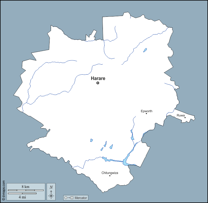 d-maps > अफ्रीका > ज़िम्बाब्वे > हरारे > बाह्यरेखा, जल-सर्वेक्षण, मुख्य शहरों, नाम
