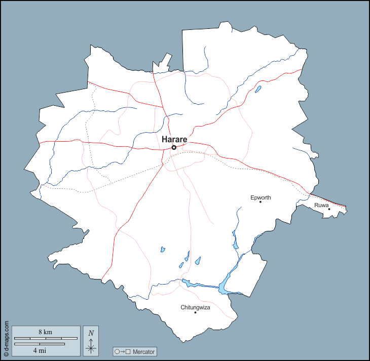 d-maps > अफ्रीका > ज़िम्बाब्वे > हरारे > बाह्यरेखा, जल-सर्वेक्षण, मुख्य शहरों, सड़कों, नाम