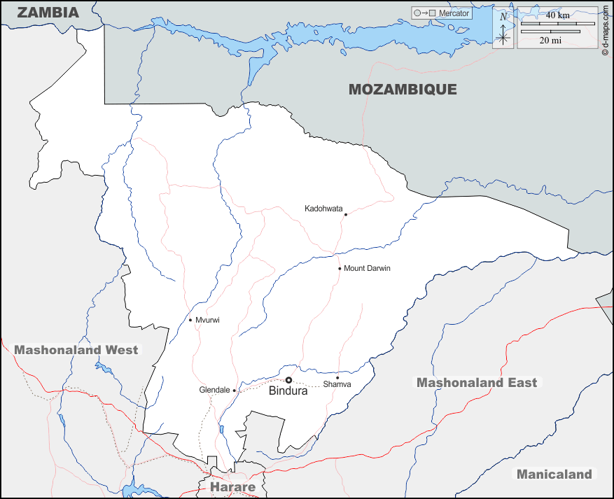 d-maps > अफ्रीका > ज़िम्बाब्वे > मशोनलैंड सेंट्रल > सीमाओं, जल-सर्वेक्षण, मुख्य शहरों, सड़कों, नाम
