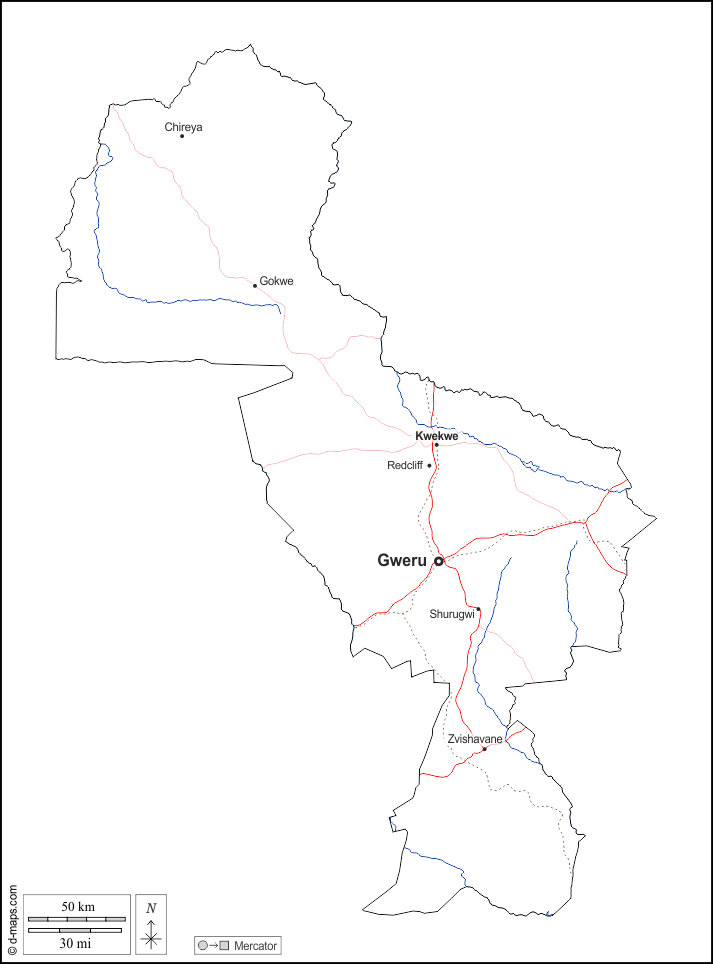 d-maps > अफ्रीका > ज़िम्बाब्वे > मिडलैंड्स > बाह्यरेखा, जल-सर्वेक्षण, मुख्य शहरों, सड़कों, नाम, सफेद