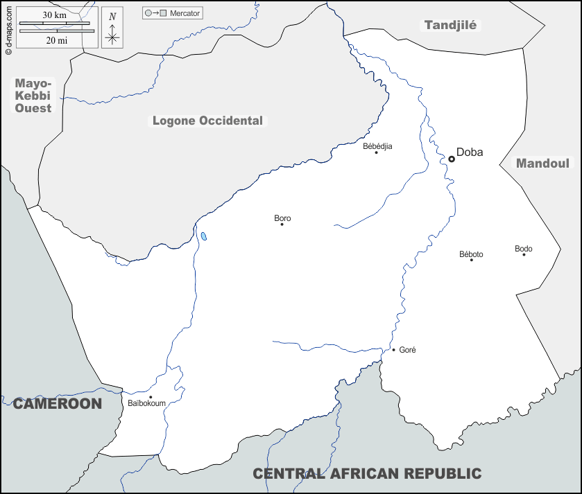 d-maps > अफ्रीका > चाड > लोगोन ओरिएंटल > सीमाओं, जल-सर्वेक्षण, मुख्य शहरों, नाम