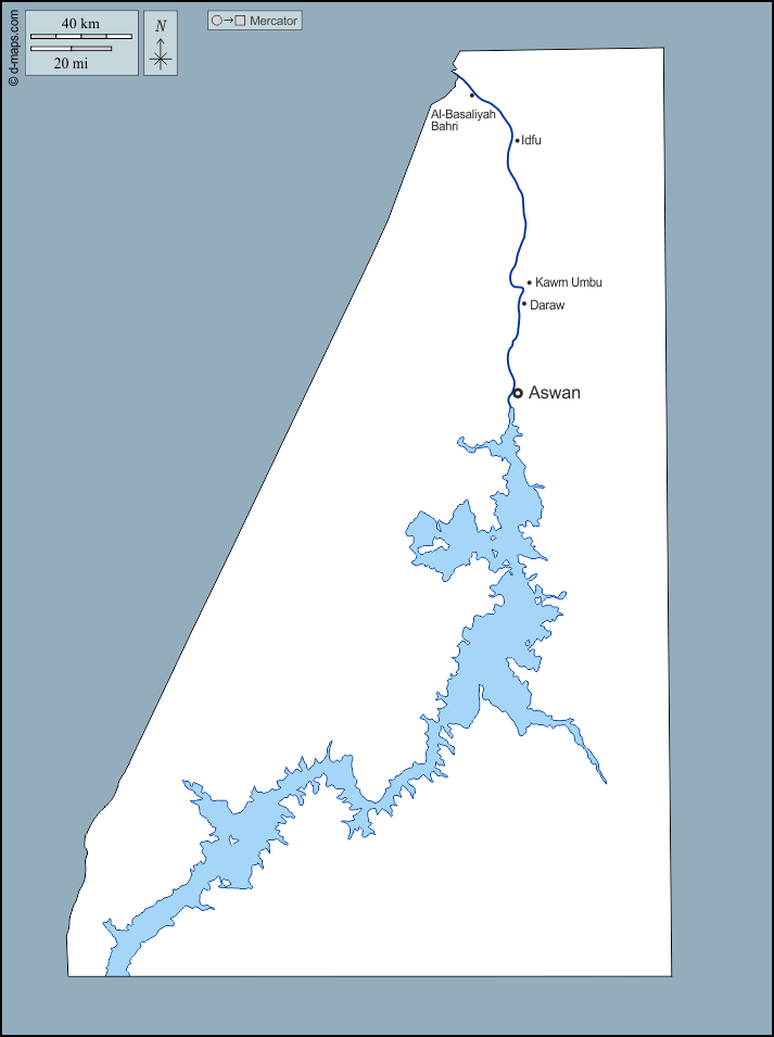 d-maps > अफ्रीका > मिस्र > असवान प्रांत > बाह्यरेखा, जल-सर्वेक्षण, मुख्य शहरों, नाम