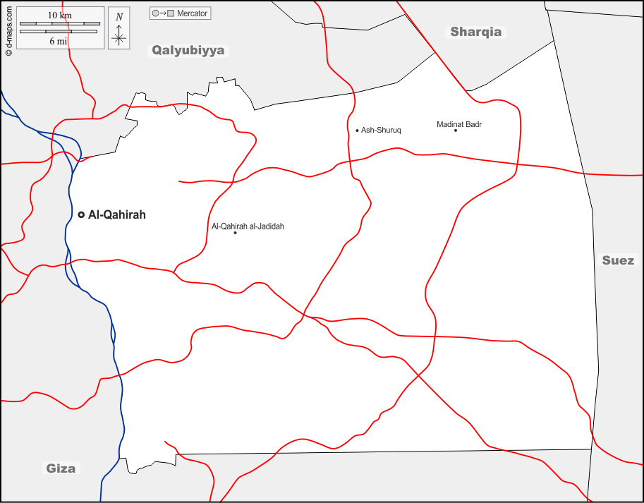 d-maps > अफ्रीका > मिस्र > काहिरा गवर्नरेट > सीमाओं, जल-सर्वेक्षण, मुख्य शहरों, सड़कों, नाम