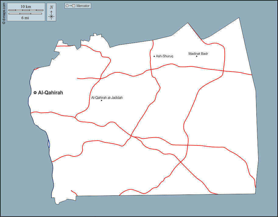 d-maps > अफ्रीका > मिस्र > काहिरा गवर्नरेट > बाह्यरेखा, जल-सर्वेक्षण, मुख्य शहरों, सड़कों, नाम