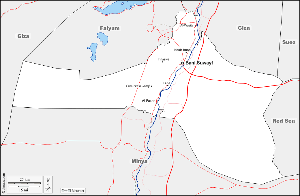 d-maps > अफ्रीका > मिस्र > बेनी सुएफ गवर्नरेट > सीमाओं, जल-सर्वेक्षण, मुख्य शहरों, सड़कों, नाम