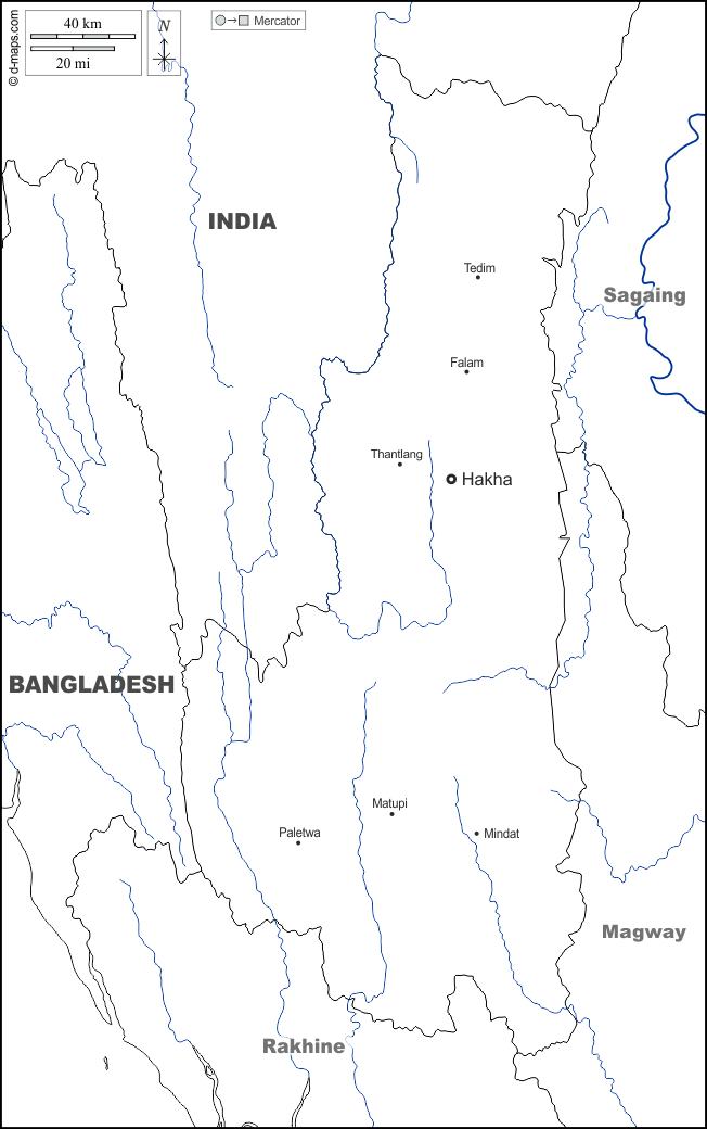 d-maps > एशिया > बर्मा म्यांमार > चिन राज्य > सीमाओं, जल-सर्वेक्षण, मुख्य शहरों, नाम, सफेद