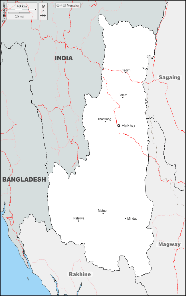 d-maps > एशिया > बर्मा म्यांमार > चिन राज्य > सीमाओं, मुख्य शहरों, सड़कों, नाम