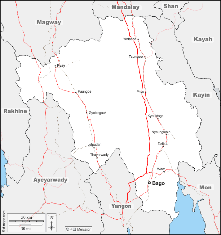 d-maps > एशिया > बर्मा म्यांमार > बगो मण्डल > सीमाओं, मुख्य शहरों, सड़कों, नाम