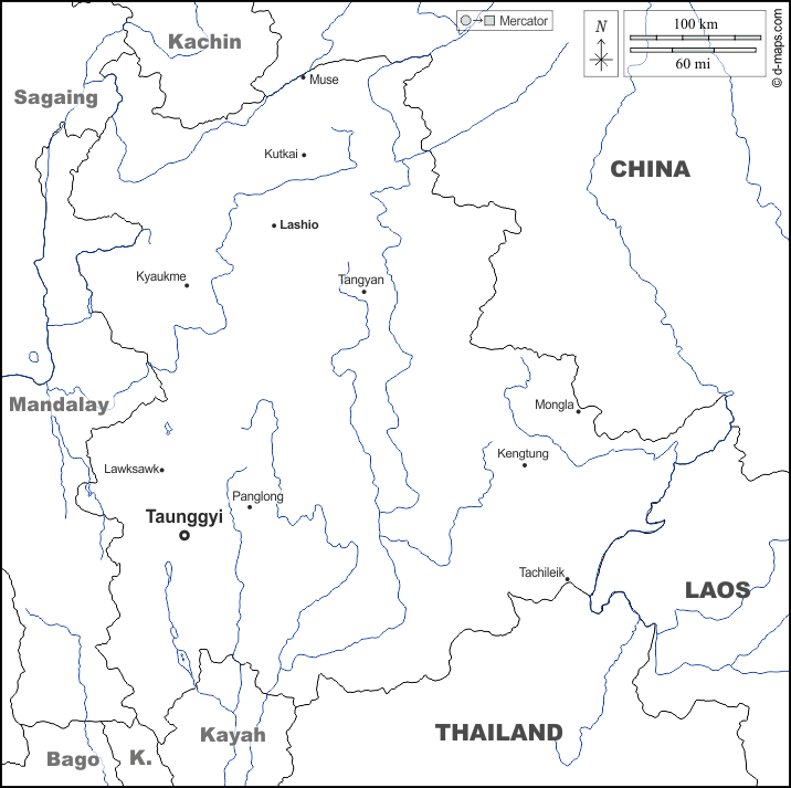 d-maps > एशिया > बर्मा म्यांमार > शान राज्य > सीमाओं, जल-सर्वेक्षण, मुख्य शहरों, नाम, सफेद