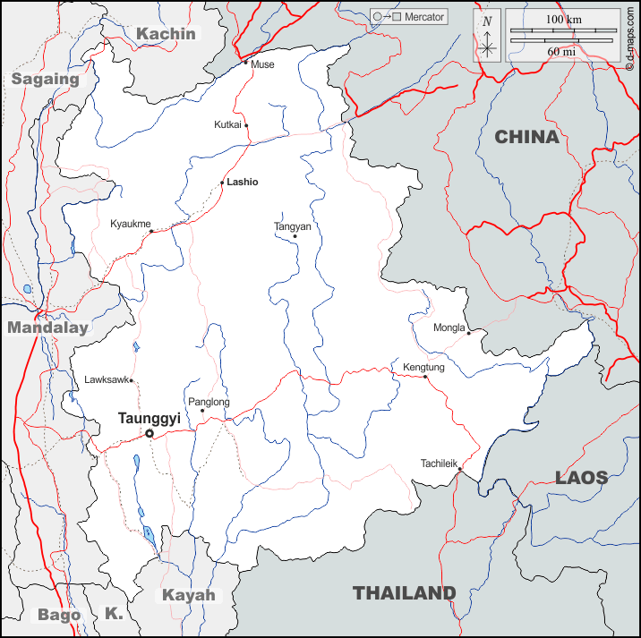 d-maps > एशिया > बर्मा म्यांमार > शान राज्य > सीमाओं, जल-सर्वेक्षण, मुख्य शहरों, सड़कों, नाम