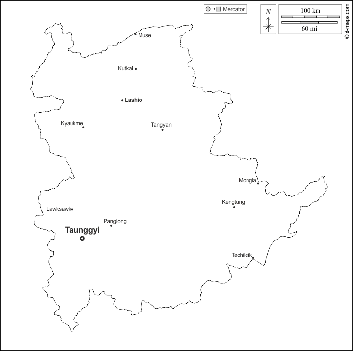 d-maps > एशिया > बर्मा म्यांमार > शान राज्य > बाह्यरेखा, मुख्य शहरों, नाम, सफेद