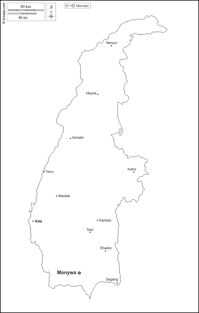 d-maps > एशिया > बर्मा म्यांमार > सगाइंग मण्डल > बाह्यरेखा, मुख्य शहरों, नाम, सफेद