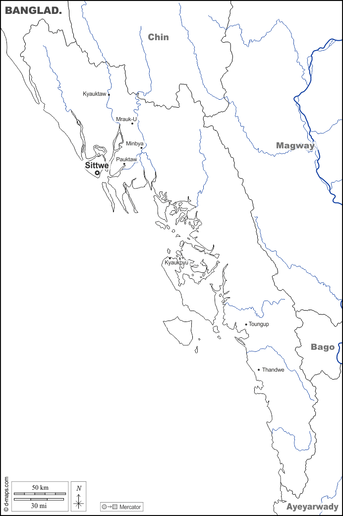 d-maps > एशिया > बर्मा म्यांमार > रखाइन राज्य > सीमाओं, जल-सर्वेक्षण, मुख्य शहरों, नाम, सफेद