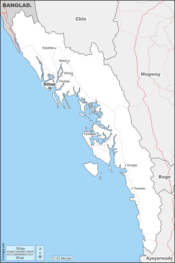 d-maps > एशिया > बर्मा म्यांमार > रखाइन राज्य > सीमाओं, मुख्य शहरों, सड़कों, नाम