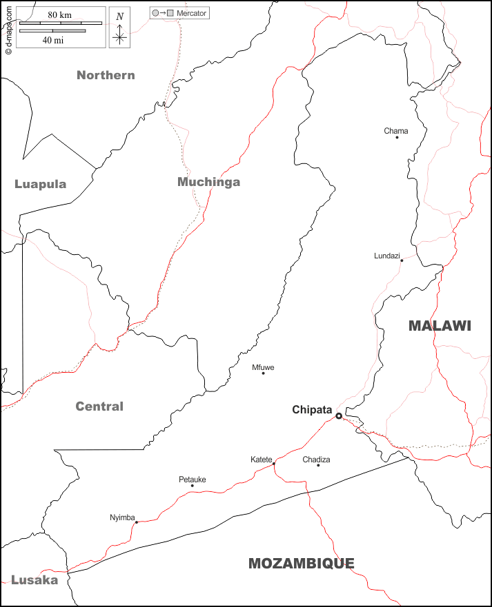 d-maps > अफ्रीका > ज़ांबिया > पूर्व का > सीमाओं, मुख्य शहरों, सड़कों, नाम, सफेद