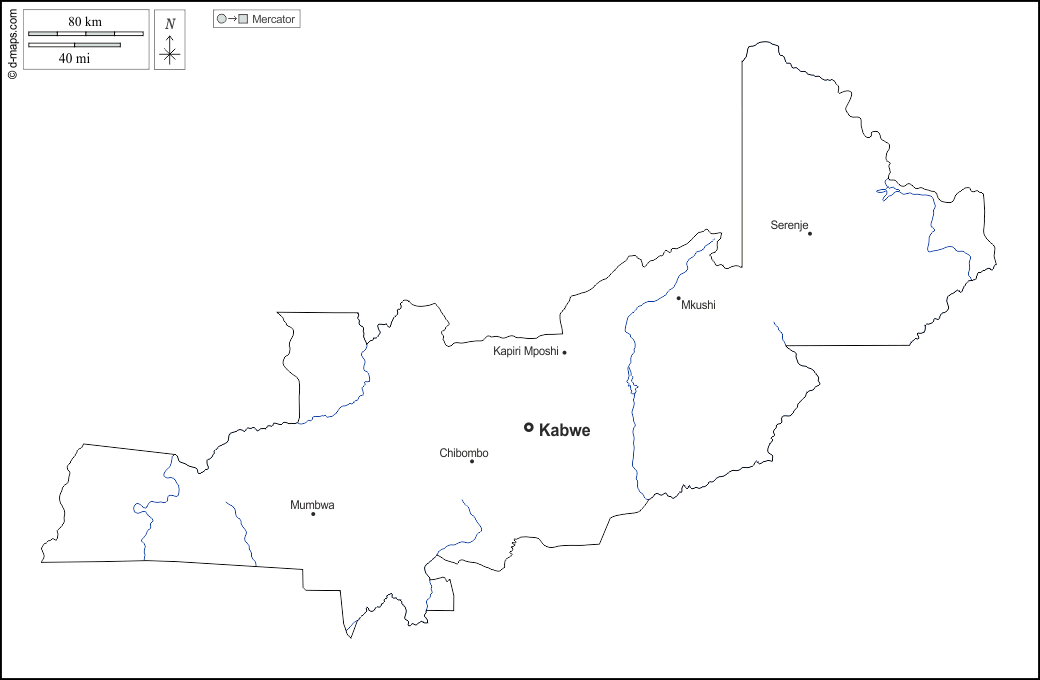 d-maps > अफ्रीका > ज़ांबिया > केंद्रीय > बाह्यरेखा, जल-सर्वेक्षण, मुख्य शहरों, नाम, सफेद