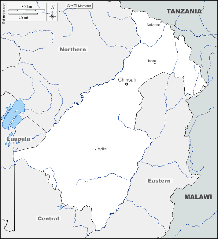 d-maps > अफ्रीका > ज़ांबिया > मुचिंगा > सीमाओं, जल-सर्वेक्षण, मुख्य शहरों, नाम