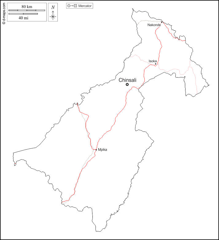 d-maps > अफ्रीका > ज़ांबिया > मुचिंगा > बाह्यरेखा, मुख्य शहरों, सड़कों, नाम, सफेद