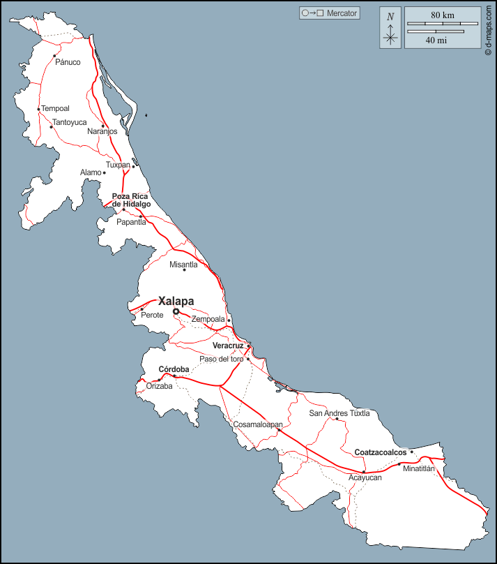 d-maps > महाअमेरिका > मेक्सिको > वेराक्रुज़ > बाह्यरेखा, मुख्य शहरों, सड़कों, नाम